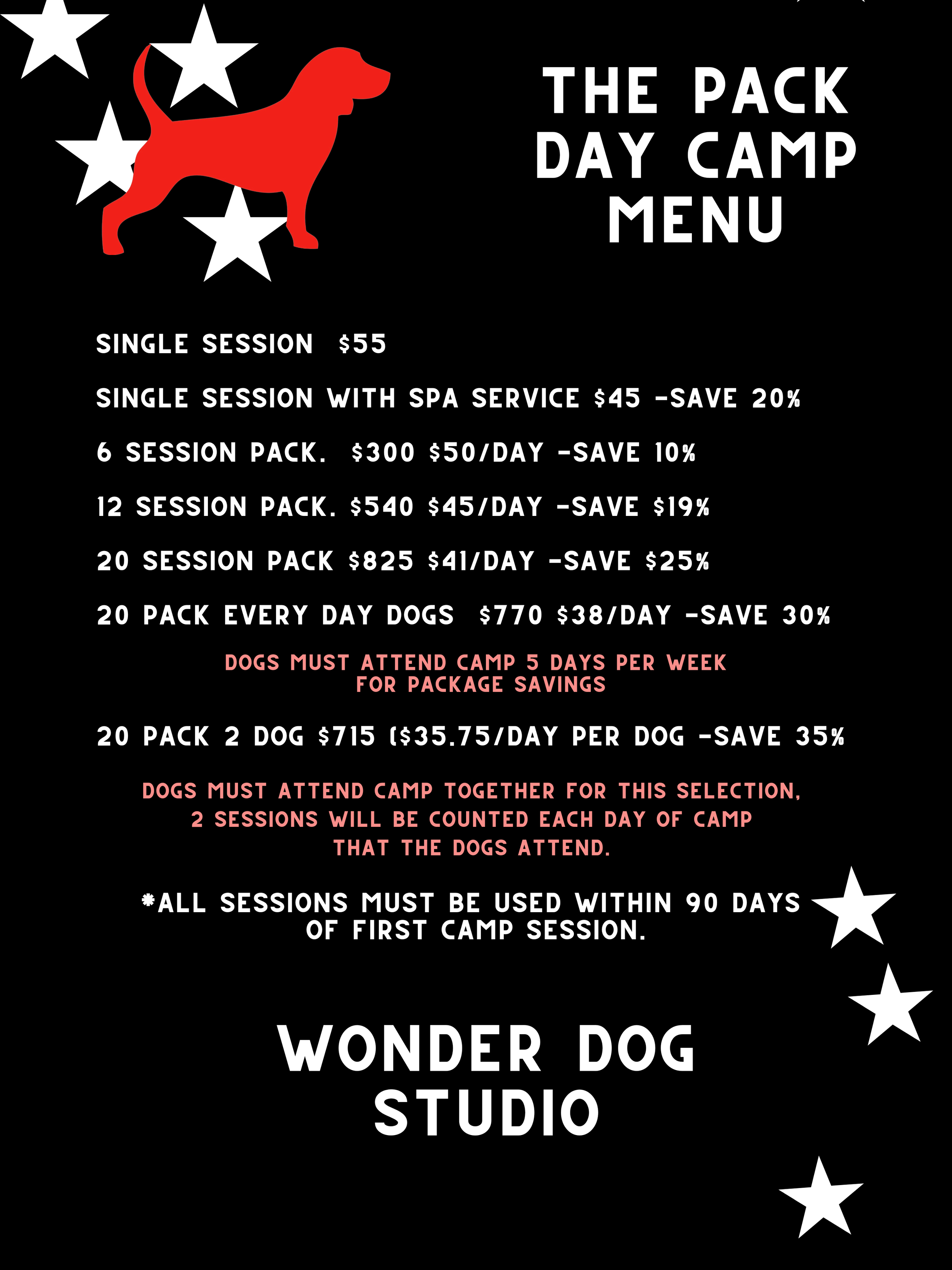 ALL DOGS OVER 6 MONTHS MUST BE SPAYED/NEUTERED TO ATTEND CAMP